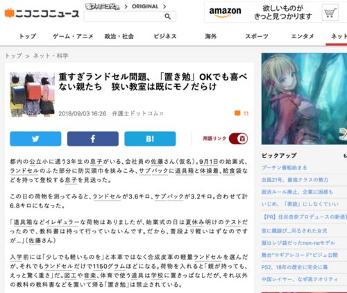 重すぎランドセル問題、「置き勉」OKでも喜べない親たち 狭い教室は既にモノだらけ http://news.nicovideo.jp/watch/nw3826934 〈記事によると〉都内の公立小に通う3年生の息子がいる、会社員の佐藤さん(仮名)。9月1日の始業式、ランドセルのふた部分に防…